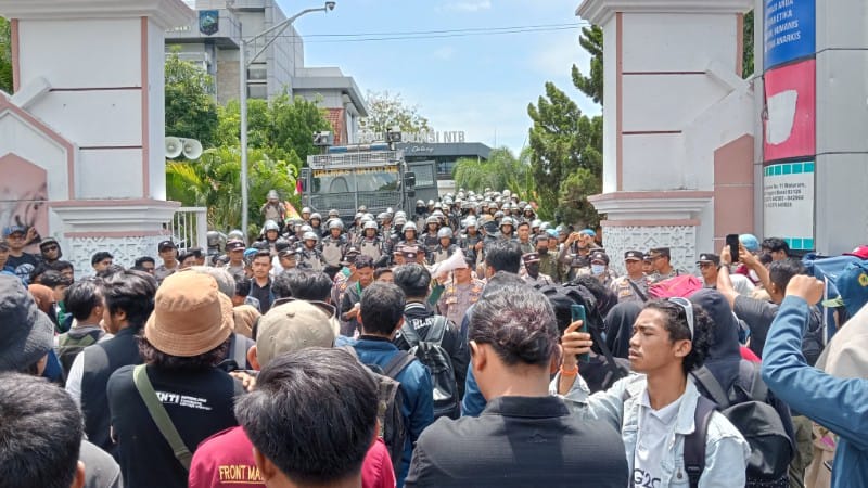 Para mahasiswa datang dengan membawa poster, spanduk, dan megafon, menyuarakan tuntutan mereka sejak pukul 09.00 WITA.